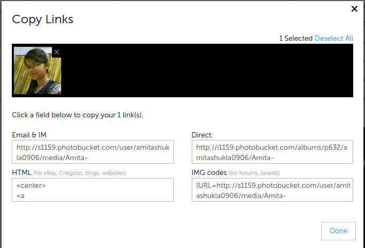 Clicking on the option provided me with the links that can be hosted on several interfaces, such as Email,IM, Blogs, HTML, Forums etc.