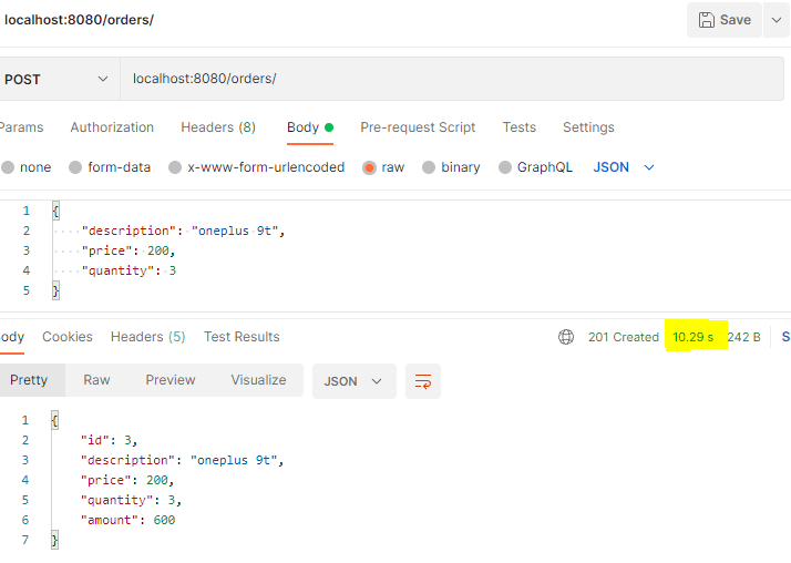 Consider the highlighted 10s it takes for this query to complete.As discussed in detail in my previous post, when using this application on production, usually a system wide or project timeout is placed. This will cause our Order creation process to fail, as it’s going to take atleast 10 seconds. Even if the timeouts are not in place, it’s a bad user experience.