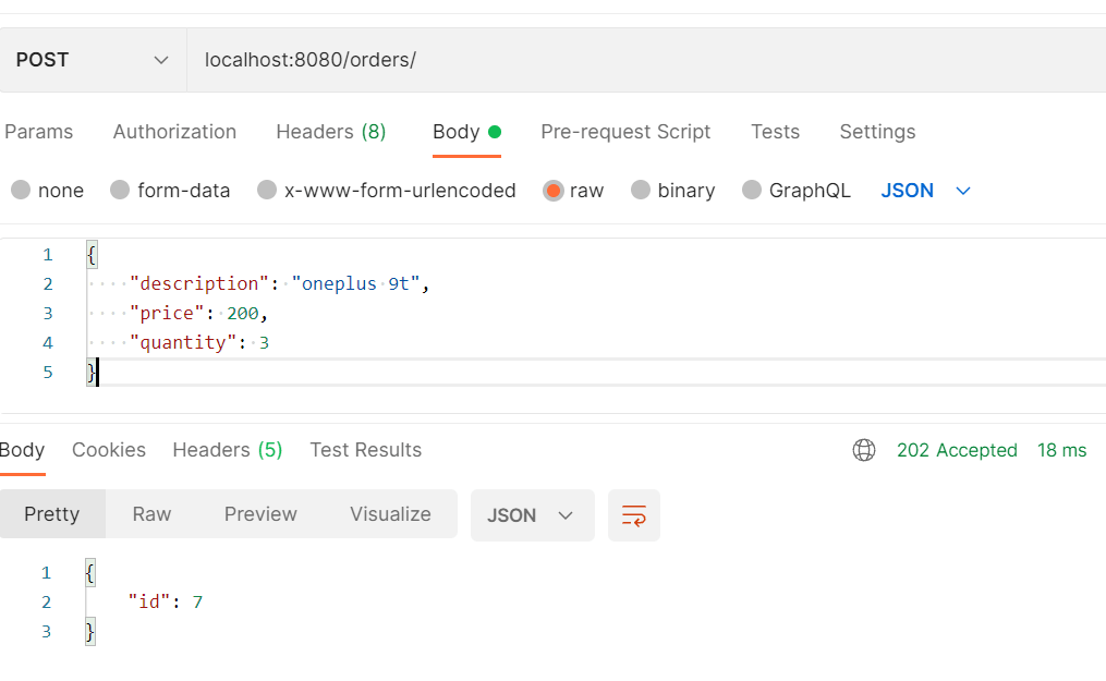 POST request to create a new Order. Observe that we receive the response code 202 Accepted. In response we receive the id of the new order being created.